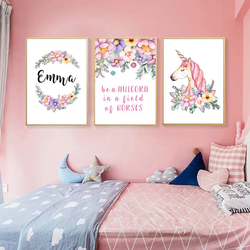 Decoración moderna rosa de dibujos animados para cuarto de niños, nombre personalizado, pinturas en lienzo, póster, impresión de imágenes artísticas para pared, regalo de decoración para habitación de niños|Pintura y caligrafía| -